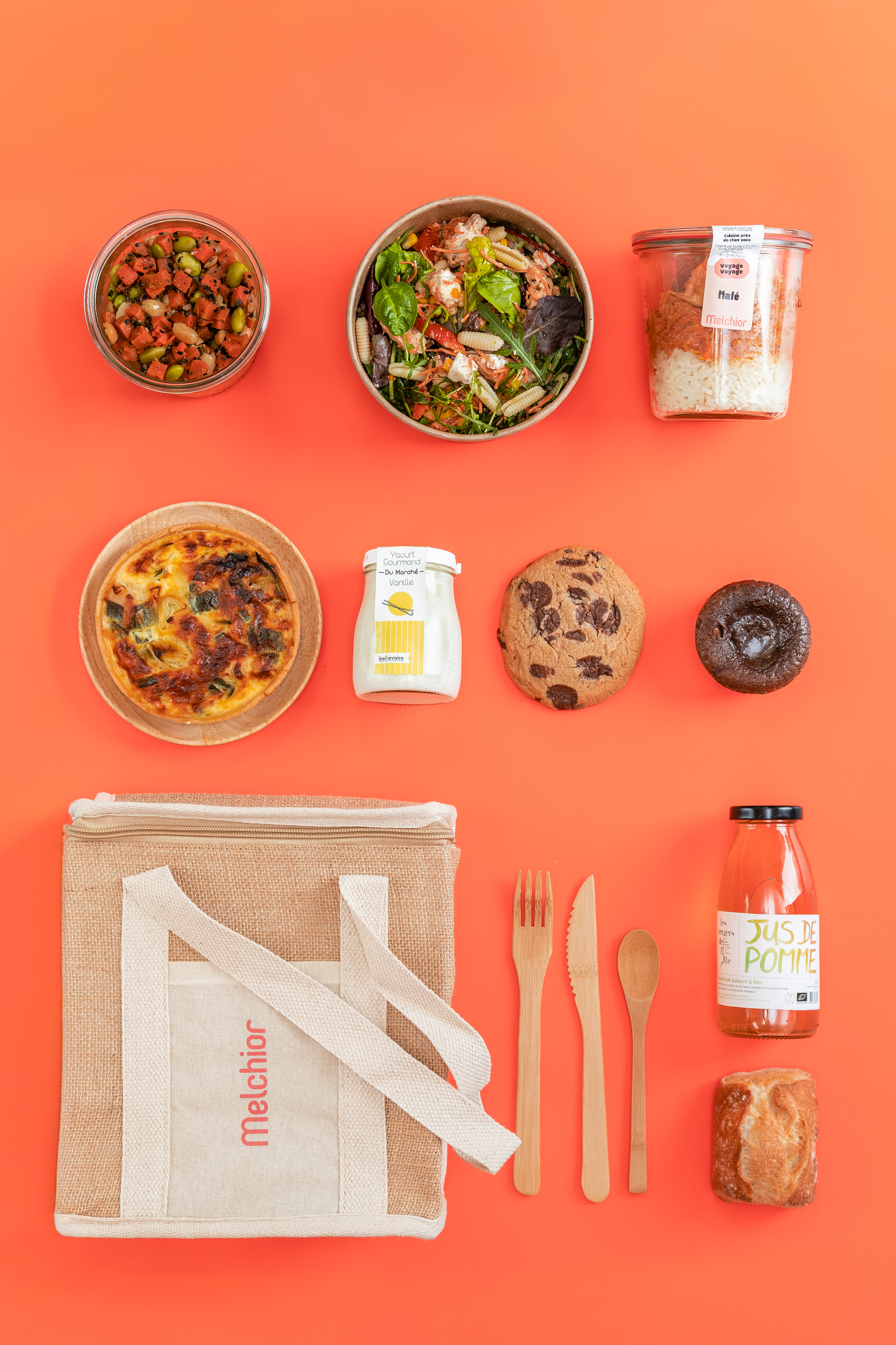 Melchior travaille avec des traiteurs locaux pour les plats et des PME locales engagées pour les douceurs sucrées.